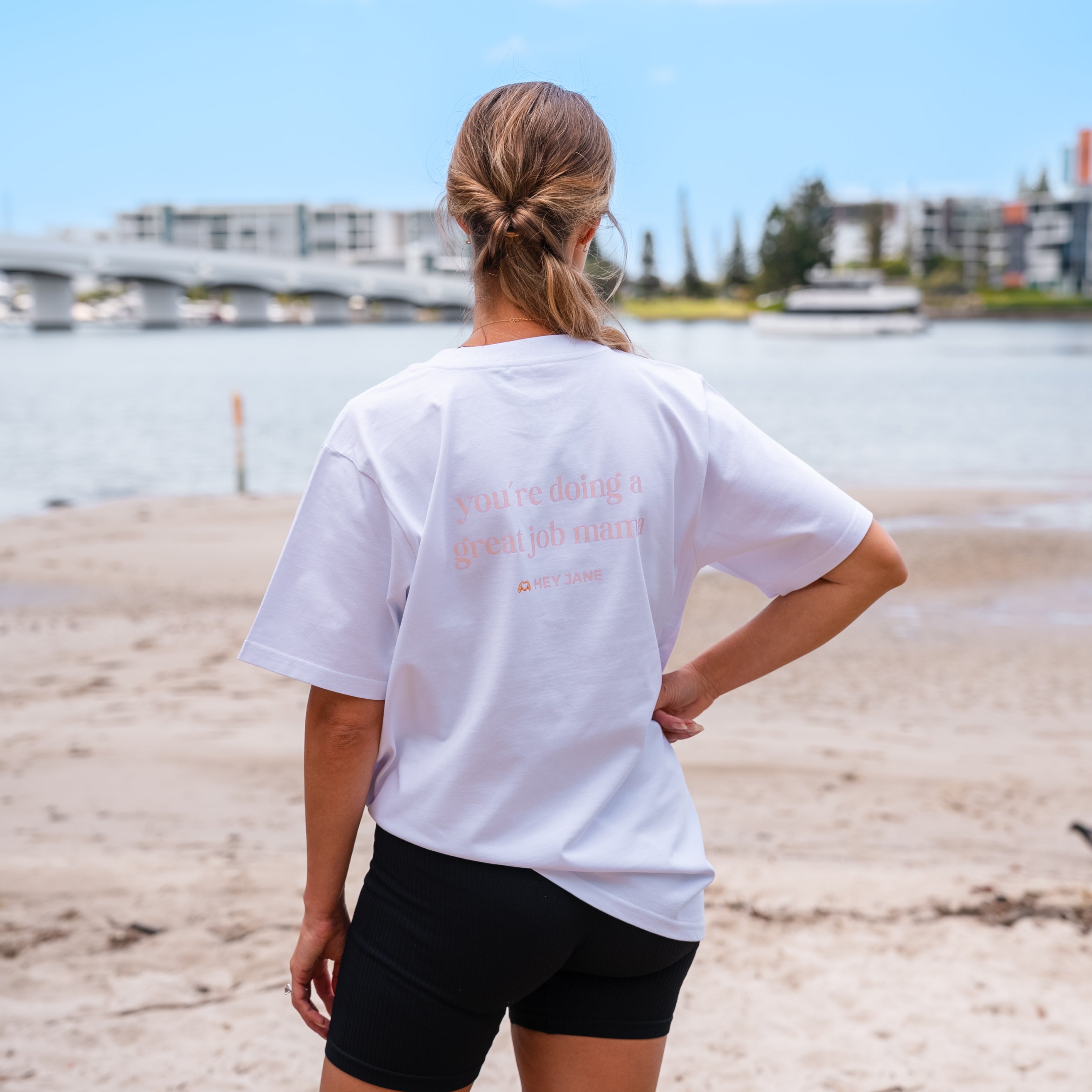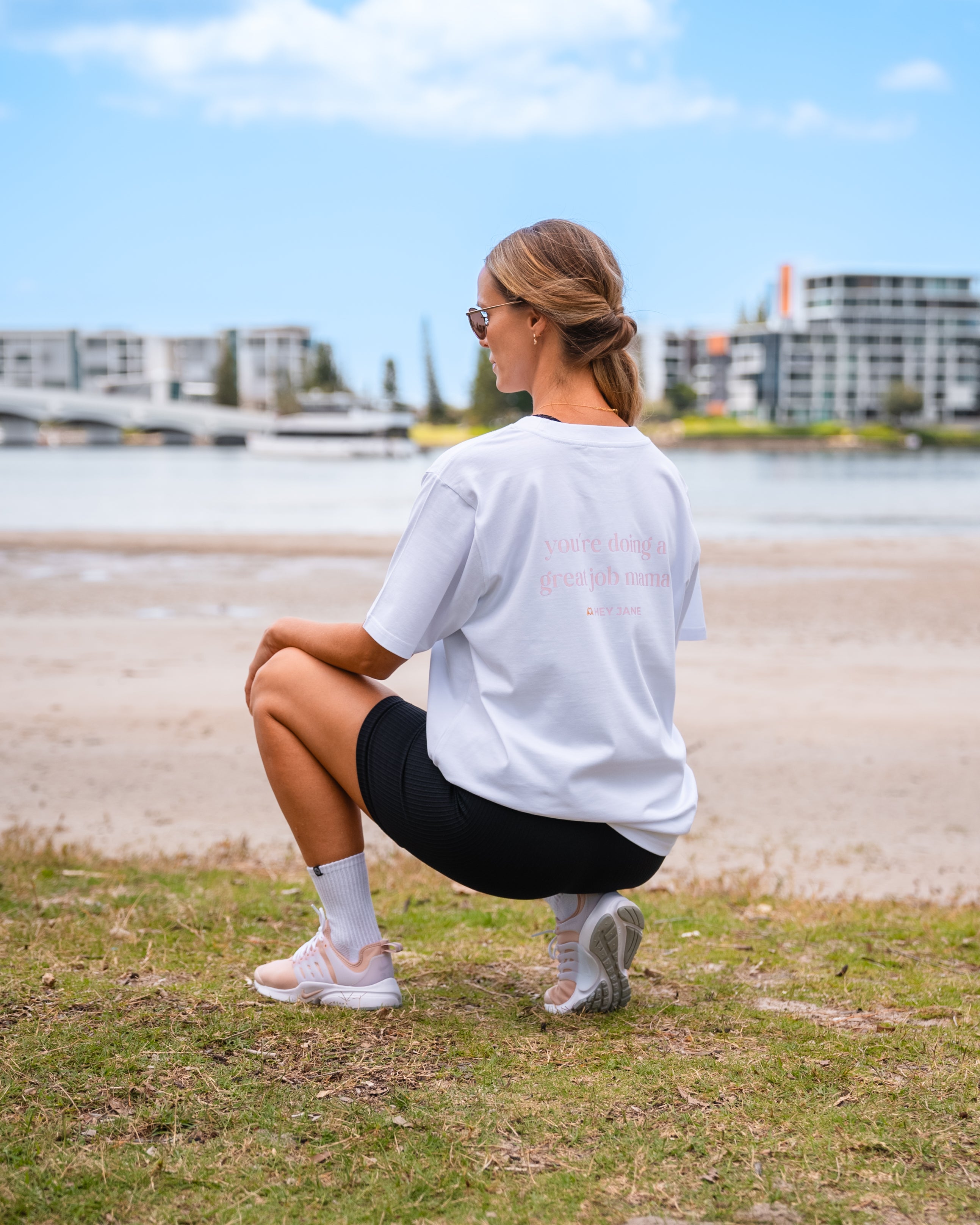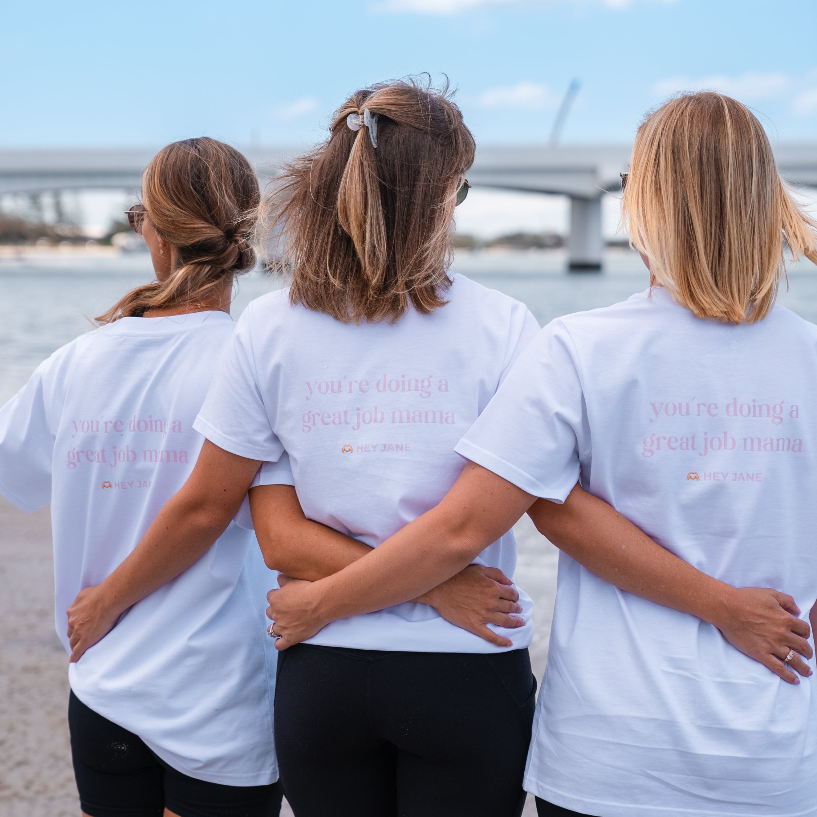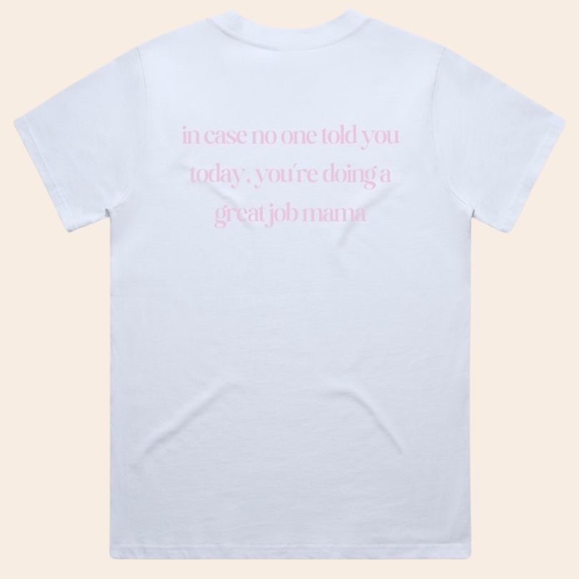 We designed this tee with the message on the back "you're doing a great job mama" in the hopes of another mother reading it when at the playground or in line at the shopping centre etc and that it would brighten her day and be the message that she needed to hear that day.